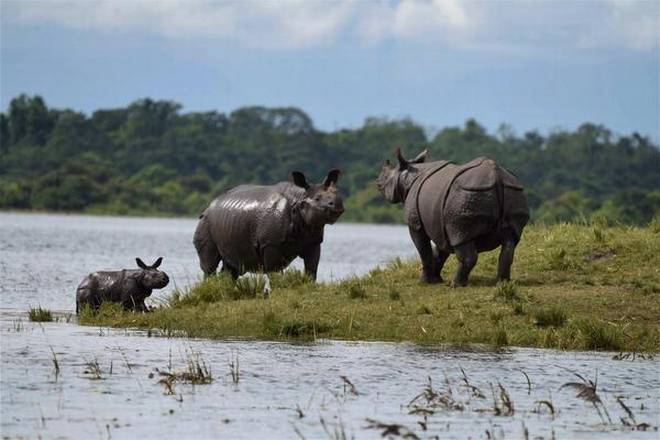 One-horned rhinos stand at an elevated area inside Kaziranga National Park. Credit: PTI