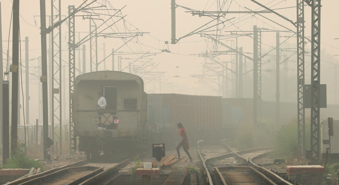 A woman crosses railway tracks as a goods train passes by, on a smoggy day in New Delhi, India, November 12, 2021. Photo: Reuters/Anushree Fadnavis