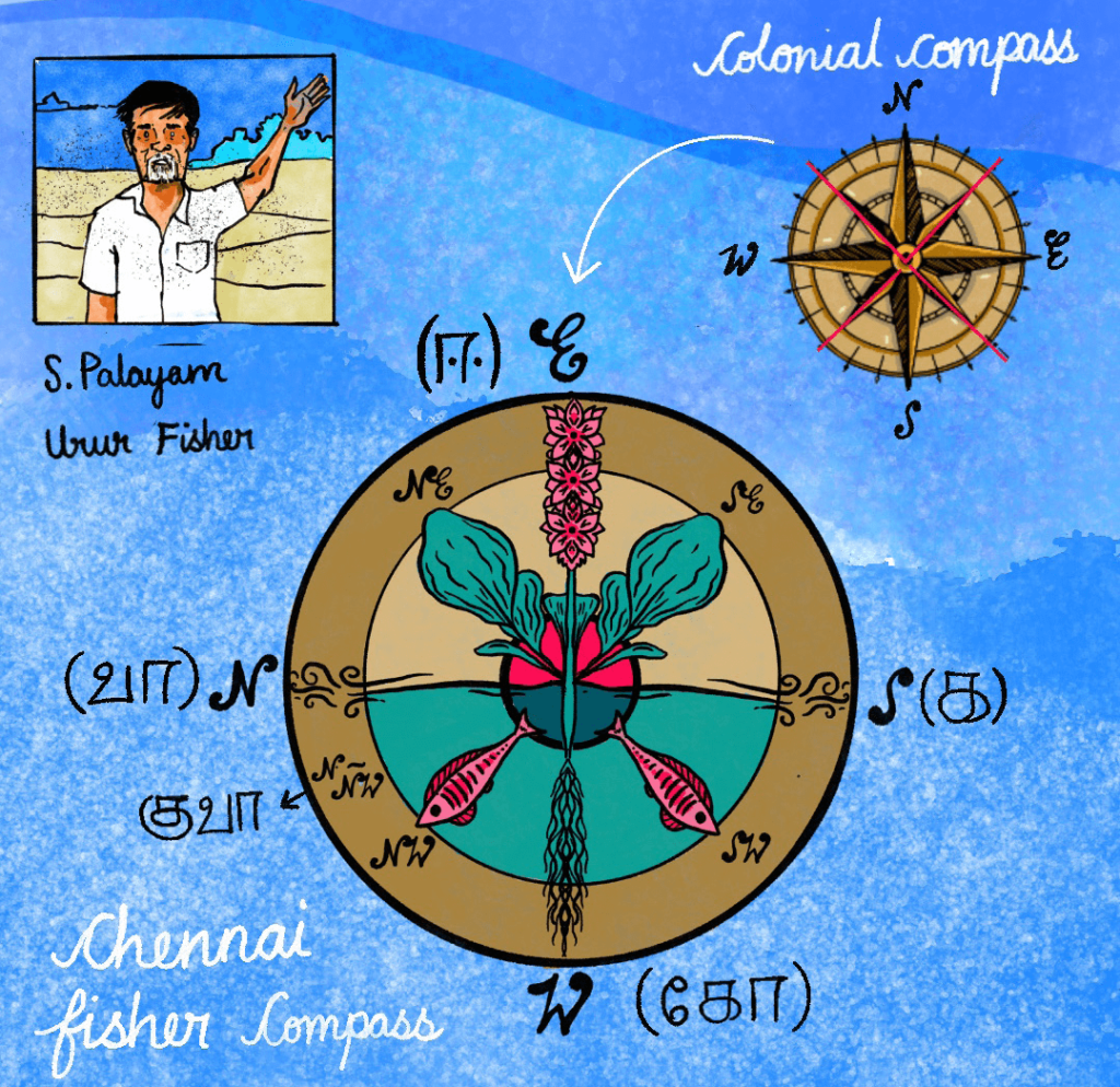 In the fishers’ worldview, the wind, as paattan (grandfather), and the sea, as Kadalamma (sea mother), are kin. Both are described as alive, whimsical, prone to provocation and appeasement, powerful and ultimately unknowable. The sea and all of nature are mysterious beings who cannot be understood by ‘knowing’ a few parts. That is why “sensing” or “making sense of” is a better descriptor of the objective of fisher science than “knowing.” The former, when combined with Aṟam (அறம்) – customary norms, rituals and practices of virtuous behaviour and doing right by the sea – provides fishers with ways of living with and surviving the seas, and perhaps even thriving. This is a significant departure from the western scientific method’s objective of generating ‘knowledge’ as a means of demystifying nature, which is described as a knowable, inanimate collection of resources that can be scientifically exploited for human use.