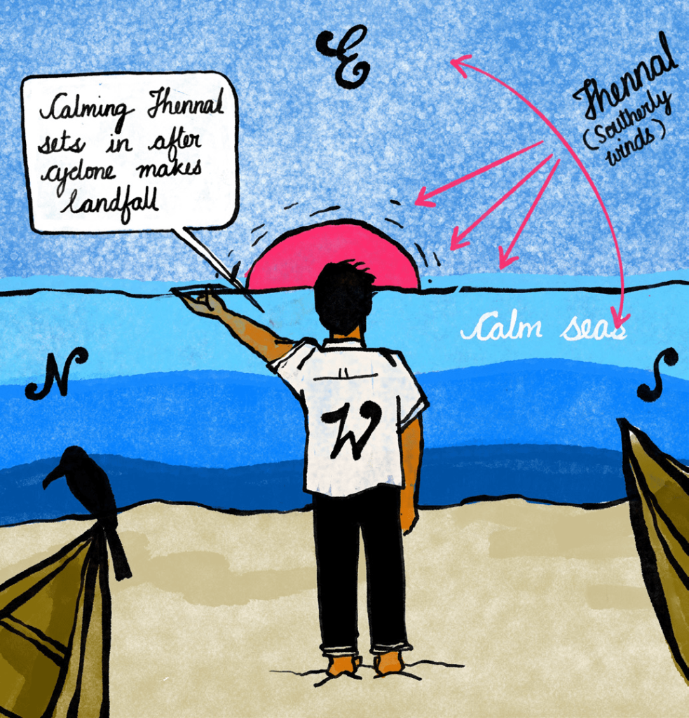 Chennai fishers categorise winds based on the directions they blow from – Eeran (Easterly); Kachan Eeran (Southeasterly); Neenda Kachan (Southerly); Kachan Kodai (Southwesterly); Kodai (Westerly); Vadamarai (Northwesterly); Kun Vaadai (North-Northwesterly); Neenda Vaadai (Northerly) and Vaadai Eeran (Northeasterly). The Kun Vaadai is the dreaded storm wind, and Kachan Eeran is the oppositional calming wind, affectionately referred to as the Thennal. Vaadai Eeran, Eeran and Kachan Eeran are sea breezes; Kachan Kodai, Kodai and Vadamarai are land breezes.