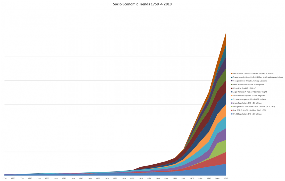 Socioeconomic Trends of the Great Acceleration, showing the rise in consumption from 1750 to 2010. The data graphically displayed is scaled for each datum's 2010 value. Source data is from the International Geosphere-Biosphere Programme. Chart: Bryanmackinnon/CC BY-SA 4.0