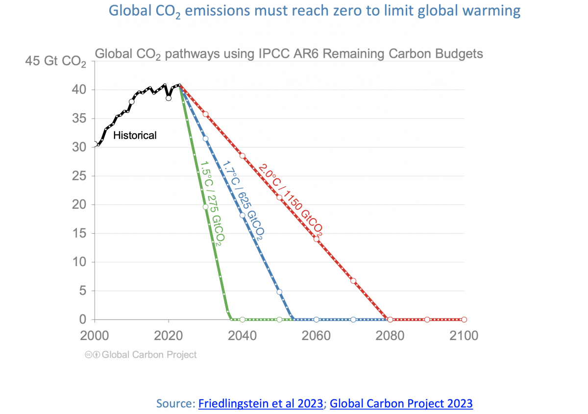 The rate at which we must phase out fossil fuel sources and adjust land-use practices for a 67% chance of limiting global warming thresholds of 1.5ºC (green), 1.7ºC (blue), or 2.0ºC red. Chart: Friedlingstein et al 2023 (https://essd.copernicus.org/articles/15/5301/2023/essd-15-5301-2023.html); Global Carbon Project 2023 (https://www.globalcarbonproject.org/carbonbudget/)