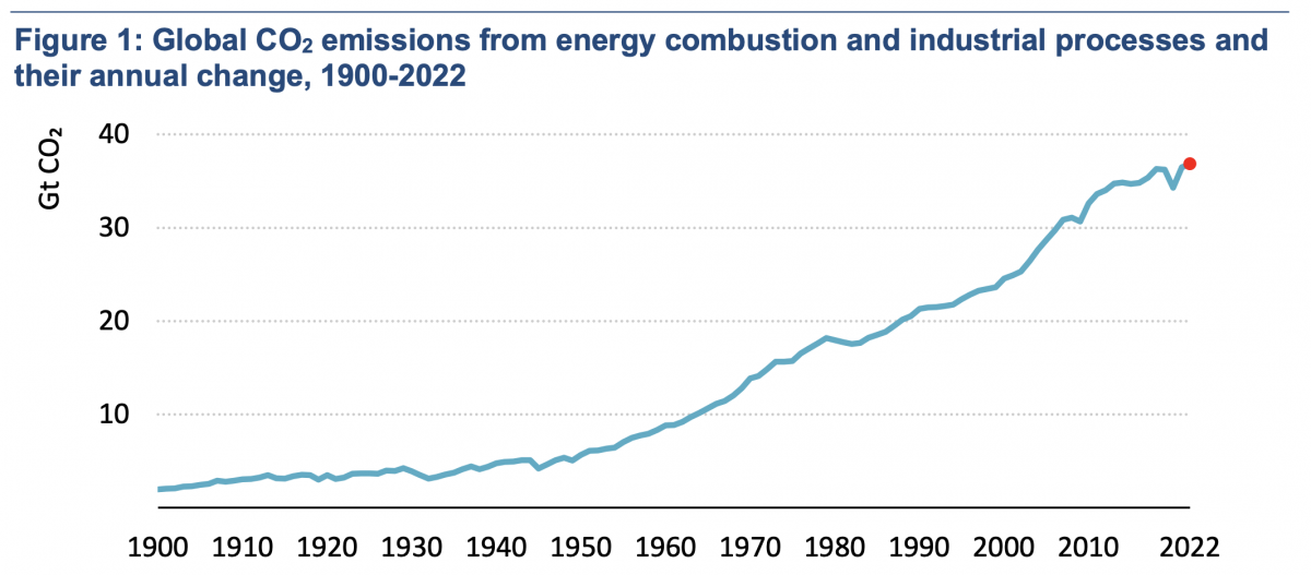 Global carbon-dioxide emissions have risen dramatically over the past several decades, slowed only periodically by global crises like economic recession, war, and pandemic. Chart: IEA report, “CO2 Emissions in 2022”