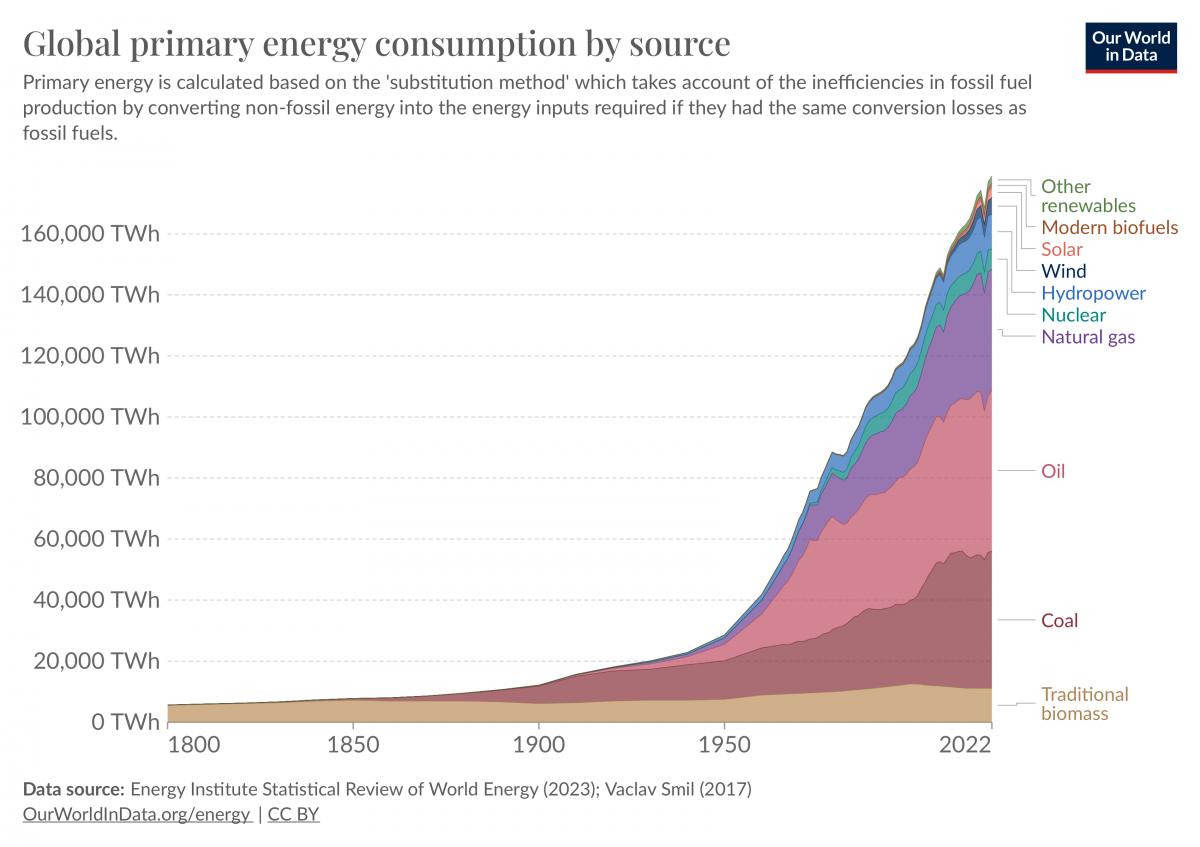 Renewable energy sources haven’t reduced our demand for combustible fossils. They have only allowed us to increase our overall energy consumption. Chart: Our World in Data