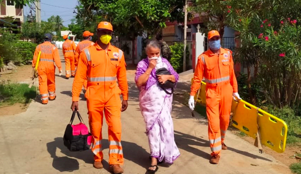 NDRF personnel evacuate an elderly woman after a major chemical gas leakage at LG Polymers industry in RR Venkatapuram village, Visakhapatnam. Photo: PTI/Twitter