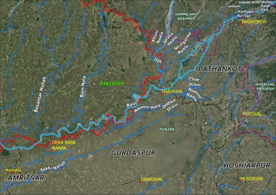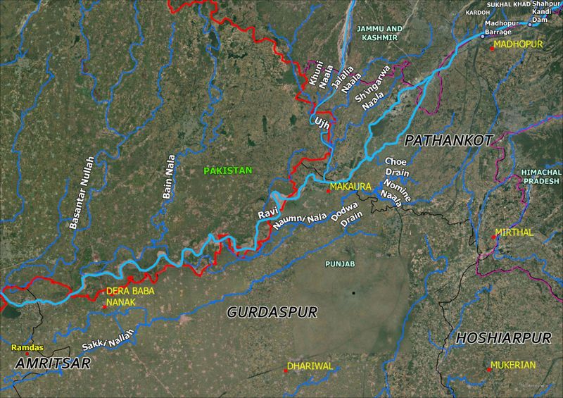 The Madhopur barrage gates are located on the downstream of the Ranjit Sagar Dam on the Ravi River in Punjab, which enters from Pathankot and flows along the Indo-Pak international border before entering Pakistan from Narowal. In Pakistan, Ravi joins the Chenab River.