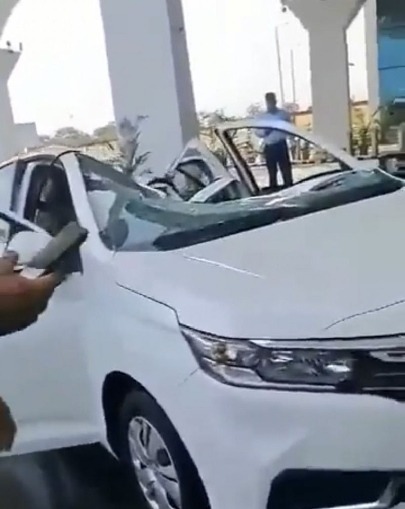A government car, which was parked underneath the canopy was damaged in the mishap, but no injuries were reported.