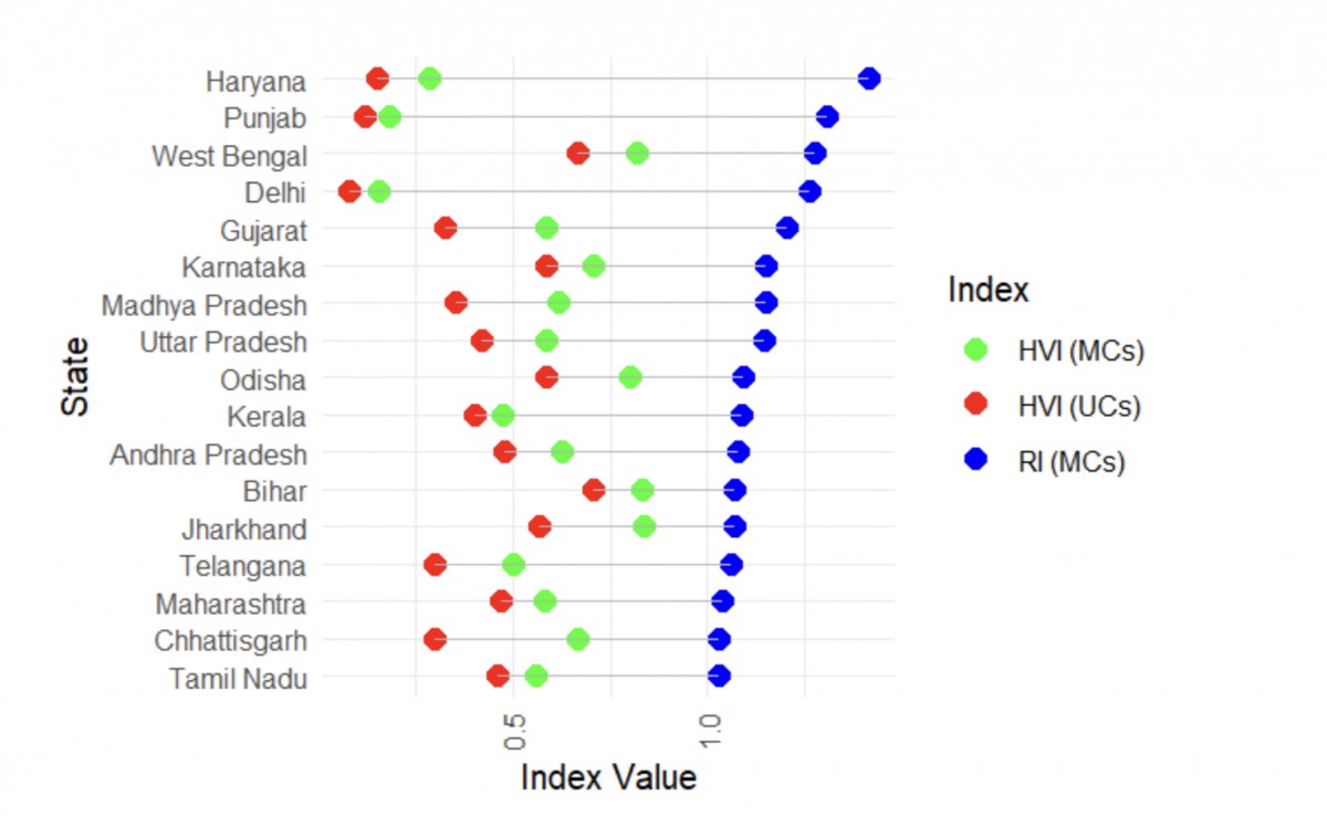As visible in the dotted bar plot, the green dots representing the HVI for marginalised castes are always higher than the red dots representing upper castes. States like Jharkhand, Bihar, West Bengal, Odisha, and Karnataka show higher levels of HVI exposure. Furthermore, the gap in HVI scores between upper and marginalised caste groups is larger in Jharkhand, Gujarat, Madhya Pradesh and Chattisgarh, indicating higher levels of inter-caste income inequality in these states.