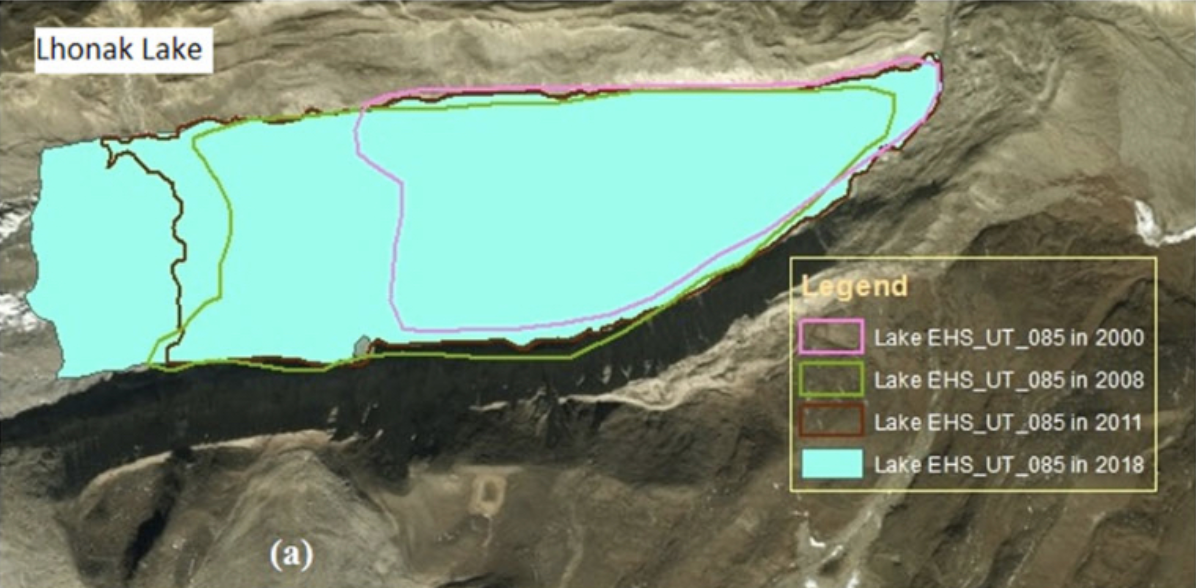 As temperatures rise due to global warming, glaciers are retreating, or getting smaller. In turn, the lakes attached to them – glacial lakes – are increasing in area. One study found that the South Lhonak Glacial Lake in the Upper Teesta Basin is growing at an average aerial expansion of 0.03 square km per year. The 2020 study found that the Lhonak Lake increased in size by 0.205 square km between 2000 and 2018 alone.