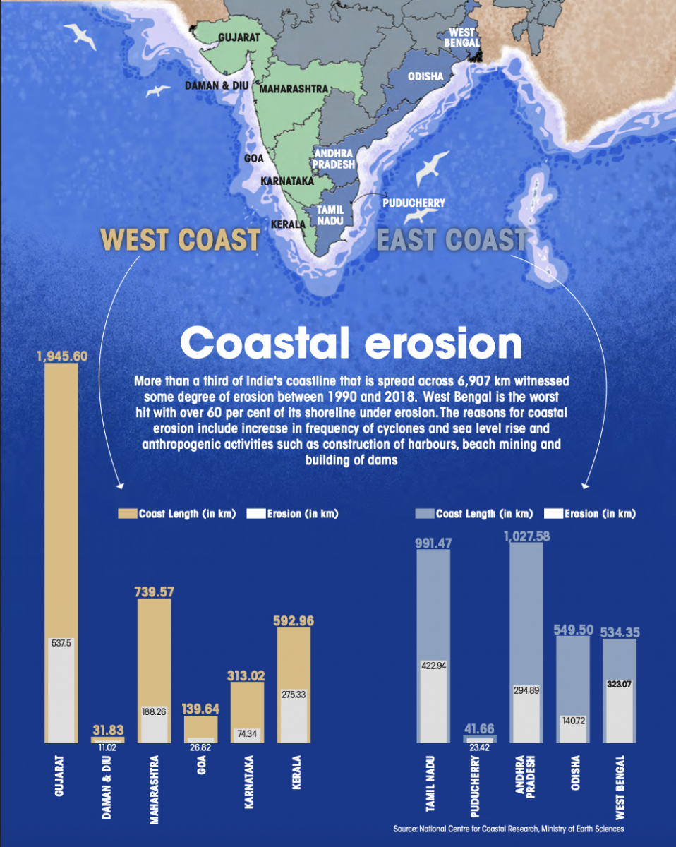 1. Our coasts are eroding. More than a third of India's coastline (~6,907 km) has witnessed some degree of coastal erosion or the other, between 1990 and 2018. West Bengal is the worst hit, with over 60% of its coasts facing erosion.