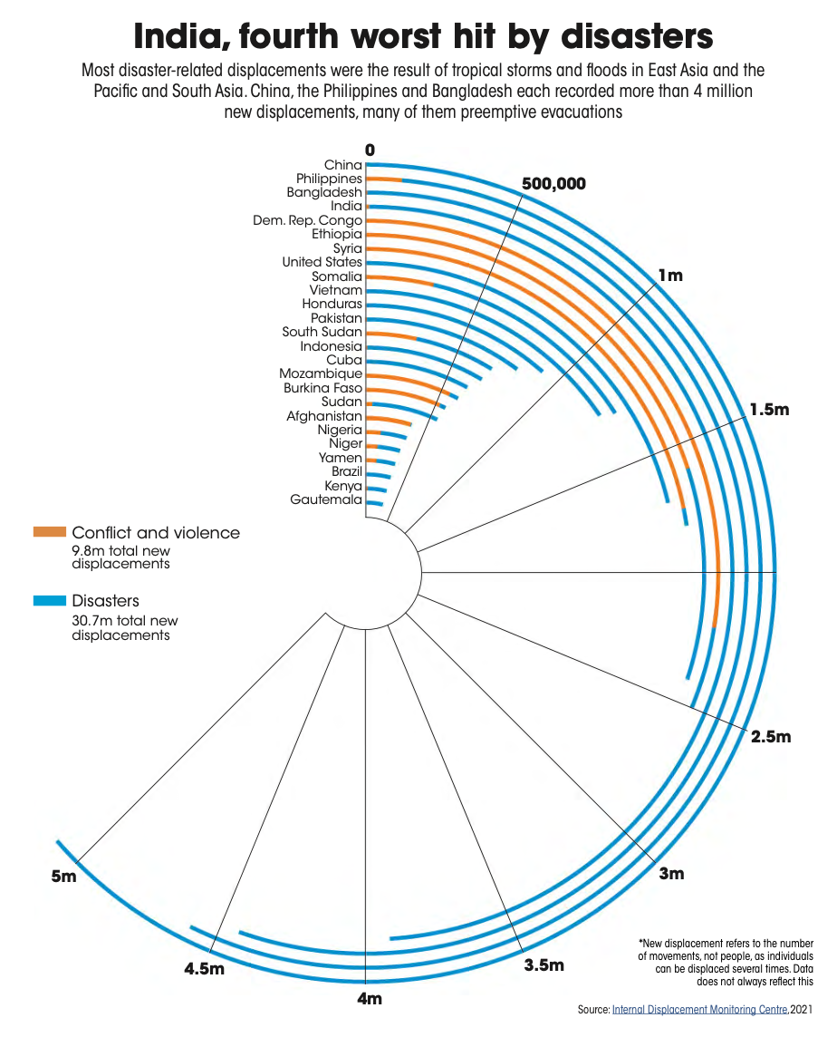 Climate change is a bigger displacer of people than conflicts and violence, the report found. Climate disasters triggered around 76% of the internal displacements that the world saw in 2020. India is the fourth worst hit by such disasters, after China, Philippines and Bangladesh. The impacts of climate change also increase instances of displacement and migration, making people more vulnerable to trafficking (since traffickers target vulnerable sections such as women and children), the report also found.