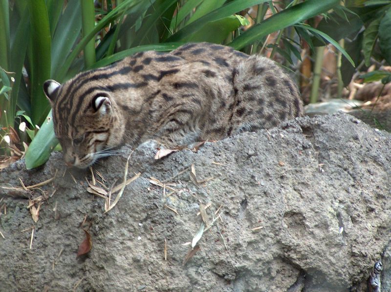 The cat sits by bending its front legs and stretching the rear limbs on the bank of the pond, and watches the water's surface in rapt attention, not so much as twitching when a passerby flashes a torchlight in its eyes. It prefers to hunt at night, when lack of oxygen in the water causes its denizens to swim closer to the surface.