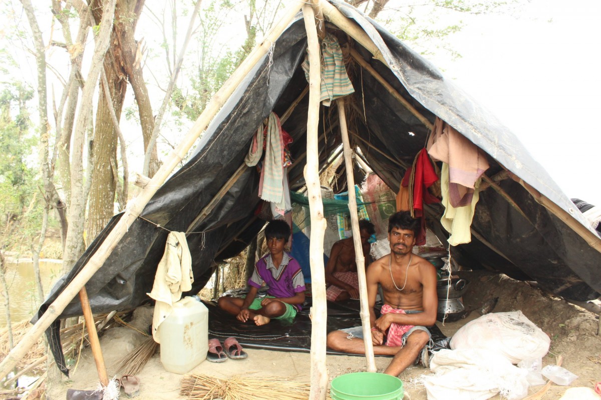 Lakhan Dutta and his family in a makeshift tent using the tarpaulin given by the panchayat.