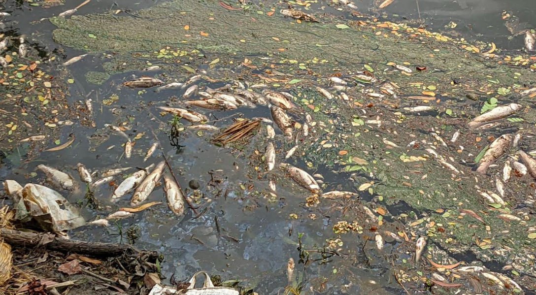 Dead fishes floating in the ponds of Purbo Dwarakapur village under Lakshmi Janardhanpur gram panchayat.