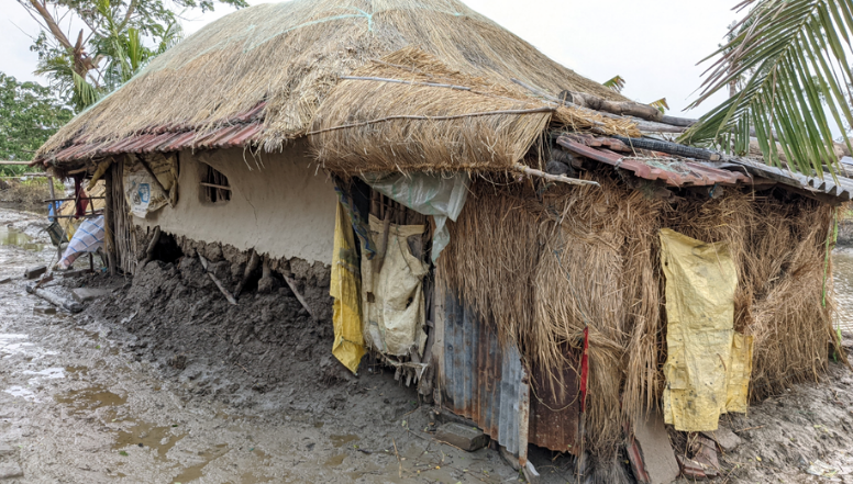 Five days after the landfall of the cyclone, hundreds of houses are still under water. The base of many houses got washed away as the remaining structure stands on bamboo. Poritosh Jana, 53, lost four bighas (21,404 square metres) of farmland, which he shared with his younger brother. Jana is now living with his family in the local school, which is being used as a shelter house.
