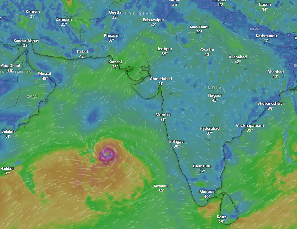 Cyclone Biparjoy developing over the Arabian Sea on the afternoon of June 8. Photo: Screenshot from windy.com
