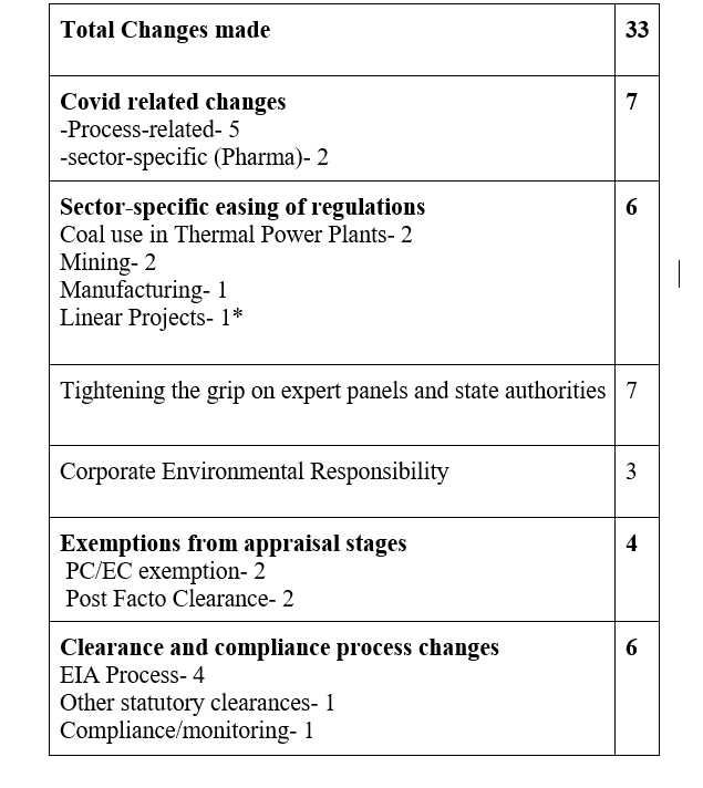 Of the 33 changes, seven were made on the pretext of the pandemic and included an extension of terms of the central and state expert appraisal panels and authorities, extension of validity of existing environmental permissions of projects and exemptions to the pharmaceutical sector.