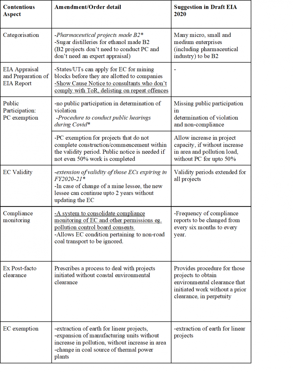 While the government is creating an impression that it cares about public opinion, it is simultaneously making discrete changes through piecemeal amendments. Below we map these changes according to the controversial aspects identified in the CSIR-NEERI report and against the changes proposed in Draft EIA law 2020.
