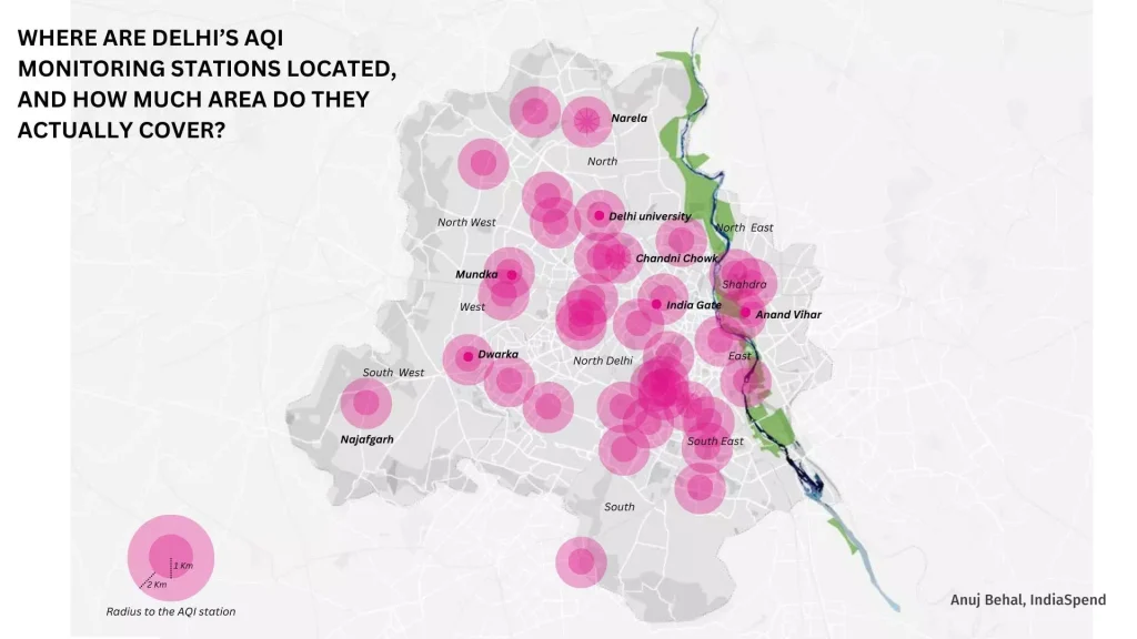 As per IndiaSpend’s analysis only 34.5% of Delhi’s geographical area is covered in a 2-km radius of a monitoring station. Many of these neighbourhoods—such as Civil Lines, Chandni Chowk, Mandir Marg, India Gate, and Lodhi Road—have overlapping 2 km zones, effectively giving them multiple layers of measurement.