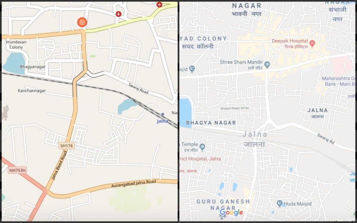 For example, this is how Jalna, Maharashtra, looks on OSM versus Google Maps – an example Palanichamy provided: