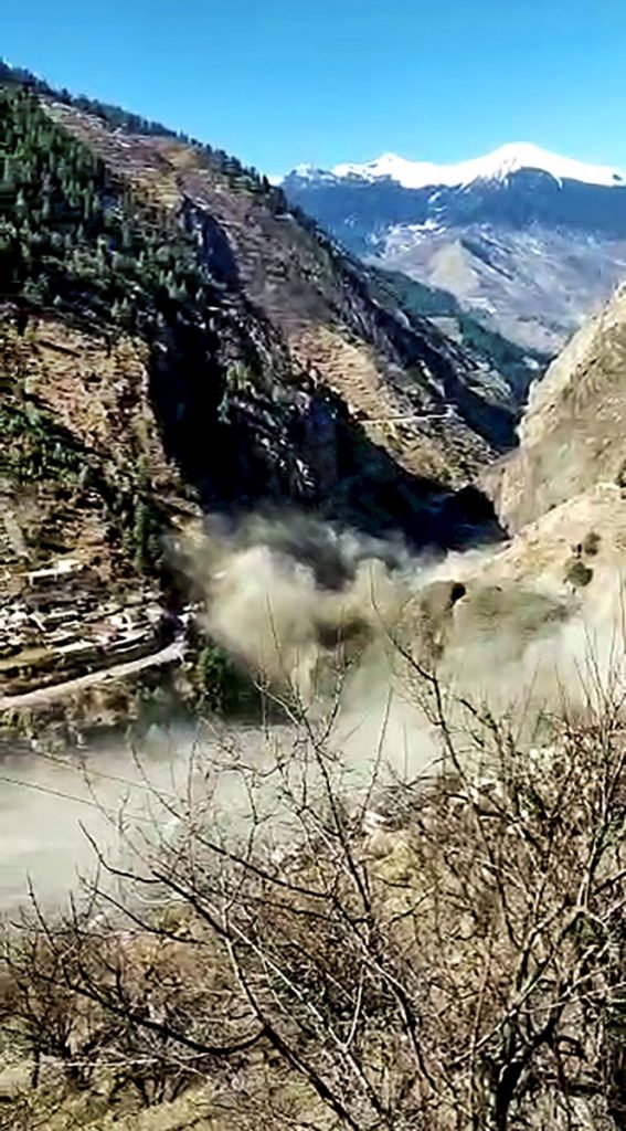 Avalanche after a glacier broke off in Joshimath in Uttarakhand’s Chamoli district causing a massive flood in the Dhauli Ganga river, Sunday, Feb. 7, 2021. Photo: PTI