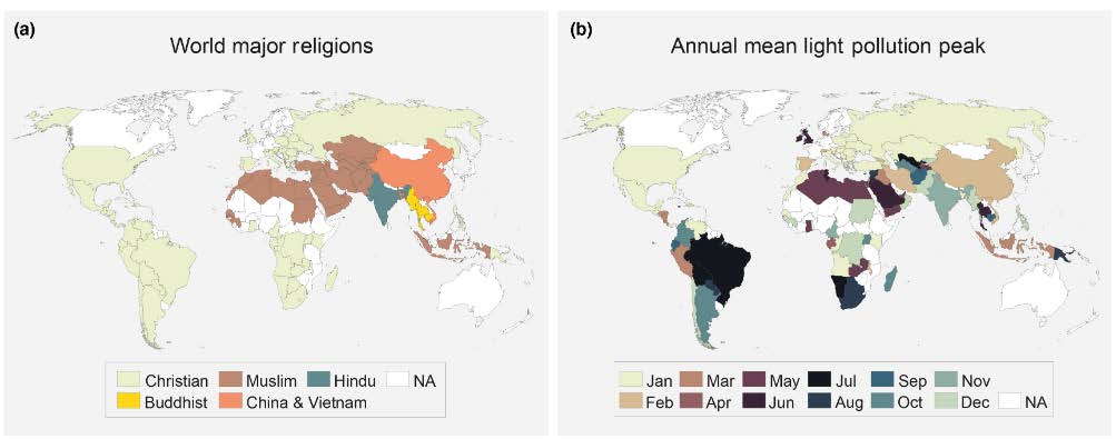 Researchers have found that night-time light peaks in Hindu-majority countries are concentrated in October–November, aligning with the festivities of Diwali. Source: Ramirez et al.