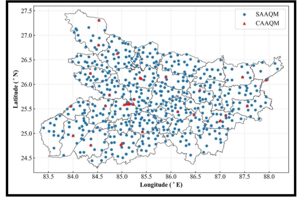 Image: Location of the SAAQM at every block across Bihar (blue dots) and the existing CAAQM (represented by the red dots). Source: Anandh et al 2025.