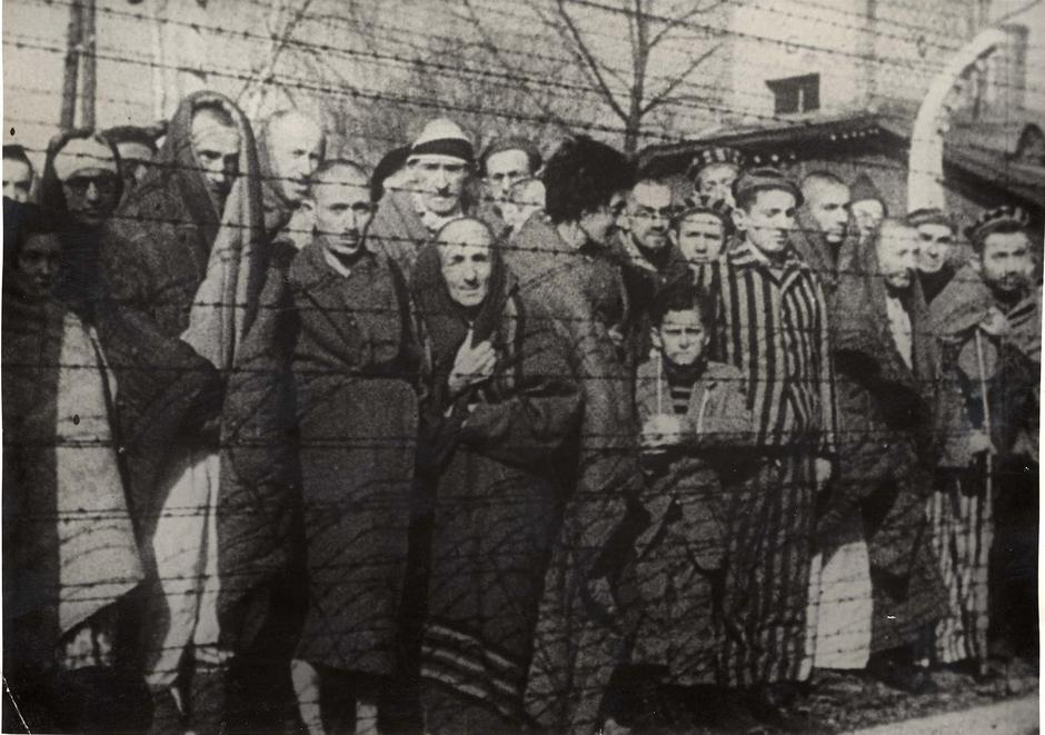 Holocaust survivors stand behind a barbed wire fence after the liberation of Nazi German death camp Auschwitz-Birkenau in 1945 in Nazi-occupied Poland. Courtesy of Yad Vashem Archives/Handout via Reuters