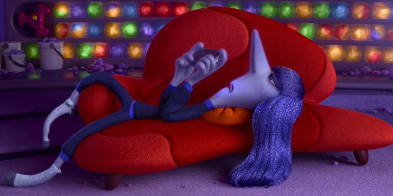 Inside Out 2 doesn’t exactly deal with these potentially negative aspects of boredom. Instead, it doubles down on the positive developmental role that boredom plays in helping Riley to manage the intensity of teenage life. Throughout the film, the heavily French-accented Ennui lays draped across a sofa wearing a dark blue sweatsuit, staring dispassionately at her smartphone screen.