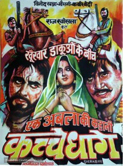A north Indian painted adaptation of the poster for 'Kacche Dhage' (1973). Dacoit films were a major draw and north Indian adaptations of posters for B and C circuits featured more guns, gore and horses.