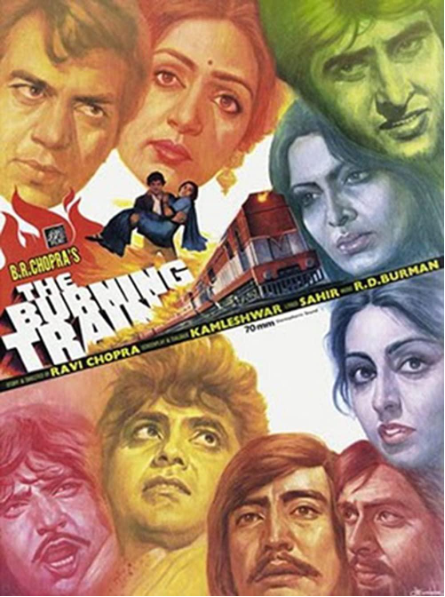 Poster for 'The Burning Train' 1980. Art by Diwakar Karkare. Nine different faces in nine different shades and a train running through them.