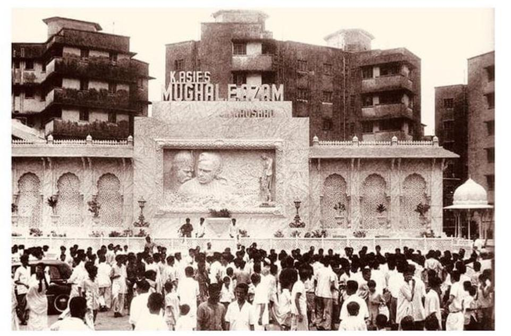 The premiere of 'Mughal-e-Azam' at Maratha Mandir on August 5, 1960. A fort-like display was erected over the theatre. Credit: Screen library