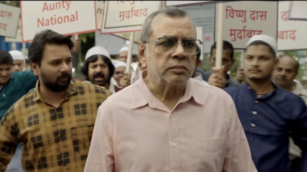 Vishnu Das (Paresh Rawal) is a state-approved tourist guide at the Taj Mahal in Agra for over 25 years. Barely eking out a living with his son Avinash (Namit Das, also a tourist guide at the Taj), he repeats the love story between Mughal ruler, Shahjahan and Mumtaz – whom the monument is dedicated to. When Vishnu’s drunken tirade about the ‘undiscovered truth’ about the Taj Mahal goes viral on social media, he’s terminated by a laughably suspicious-looking ‘Muslim’ management committee. In the film, the Agra tourist association is overrun by men in long beards, kohl-eyes and skull caps. Nothing specifies the film’s target audience quite like the keffiyehs worn by the men – who harass Vishnu and his family after he files a public interest litigation challenging the history of Taj Mahal.