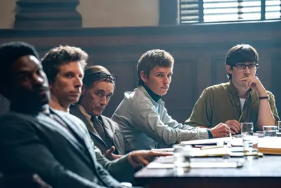 The drama’s first few minutes, blending archival newsreels and film scenes, are frenetic and economic. The introduction unfurls a carpet of information. It lists out the main protagonists: the Students for a Democratic Society leaders Tom Hayden (Eddie Redmayne) and Rennie Davis (Alex Sharp); the Youth International Party co-founders Abbie Hoffman (Sacha Baron Cohen) and Jerry Rubin (Jeremy Strong); the pacifist activist David Dellinger (John Carroll Lynch); and the Black Panther chairman Bobby Seale (Yahya Abdul-Mateen II). It reveals their characters: Tom and Rennie, ambitious activists, are restrained and calm; Abbie and Jerry, countercultural icons, zing the status quo with subversive humour and flamboyant demeanour; David, a family man, values decorum and rules; and Bobby, the co-founder of a young Black Power political organisation, is assured yet fiery.