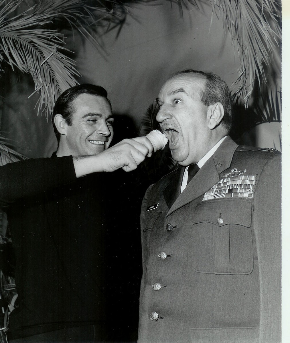 Sean Connery with retired Lt. Col. Charles Russhon during the production of "Thunderball". Photo: Rachel Arroyo/Public domain via Wikimedia Commons