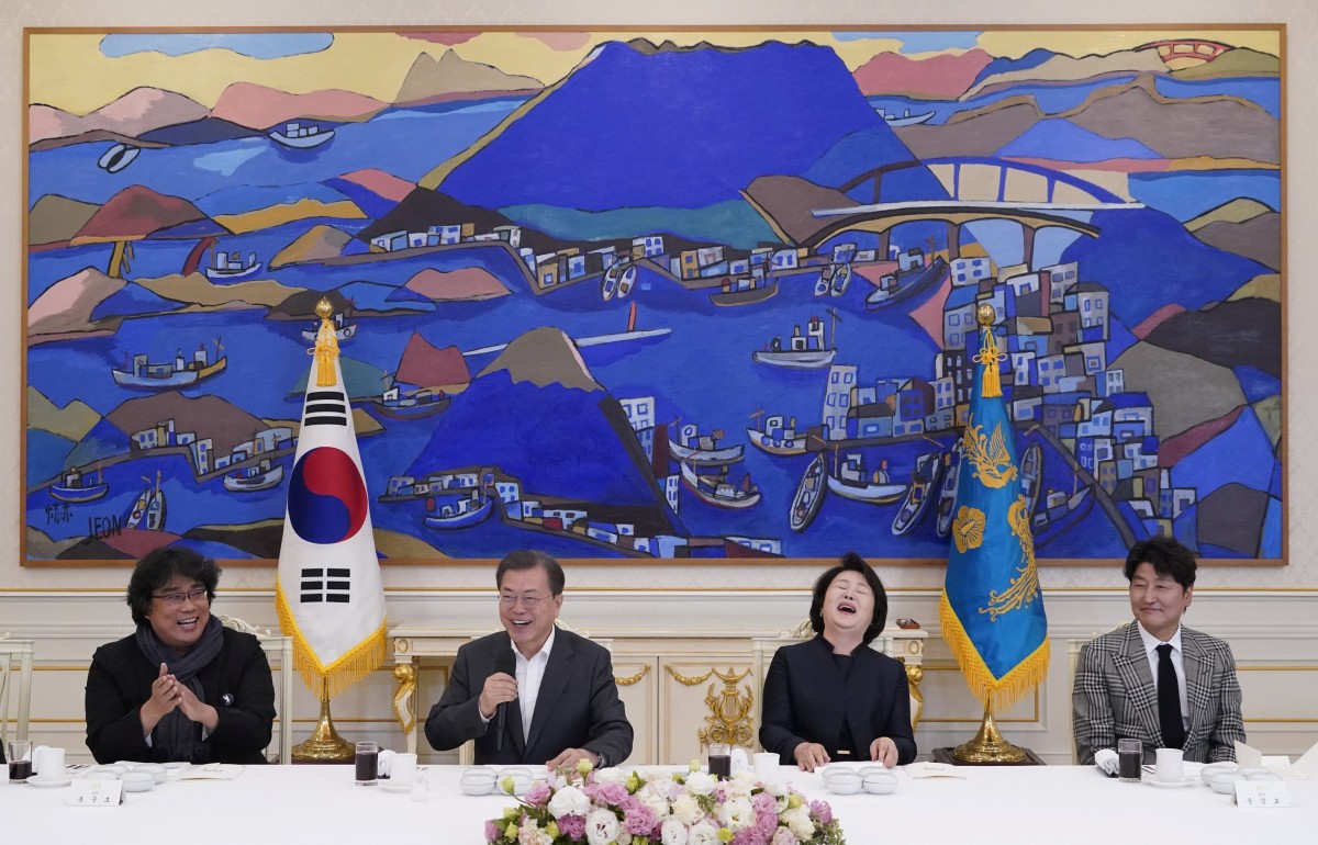 South Korean President Moon Jae-in speaks as Bong Joon-ho, director Parasite, reacts during a luncheon at the Presidential Blue House in Seoul, South Korea, February 20, 2020. Photo: Reuters/Kim Hong-Ji/Pool