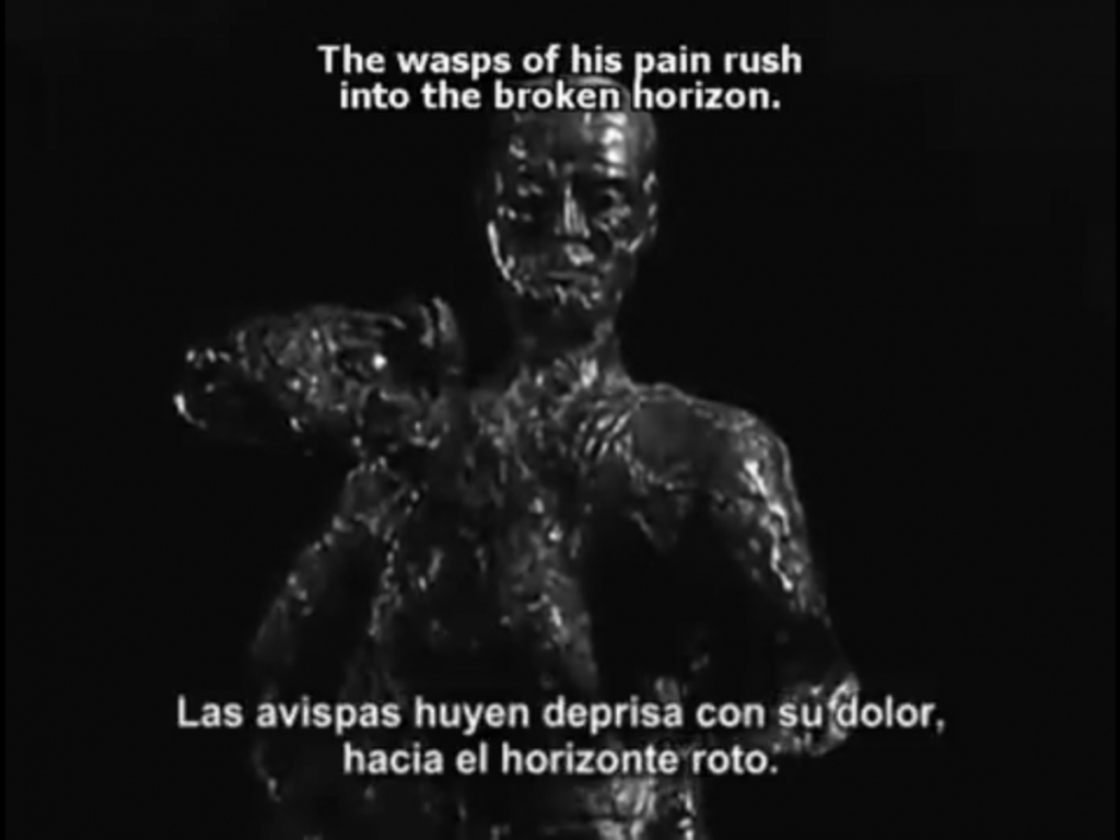 That intensity tapers off slowly, however, before the image of the Good Shepherd forms itself bit by bit on the screen. First, we see the man’s feet, planted firmly on the pebbly earth; then his legs, spindly and long; then the torso, the lamb pressed to it earnestly; then on to his face, unremarkable but for his high forehead with the innumerable furrows running across it, and his enormous eyes with their piercing gaze. The music sheds its strident note, now sounding hopeful and radiant as the voice-over’s impassioned words seem to tumble out verily from the viewer’s throat: “Innocence will overcome destruction. Guernica.”