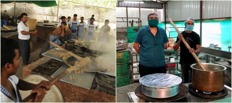 Making haleem, then and now. On the left, a pre-lockdown photo (Credit: Special Arrangement) and on the right, haleem being prepared during the lockdown at Delhi-6 cloud kitchen, Hyderabad. (Credit: Arijit Yadav)