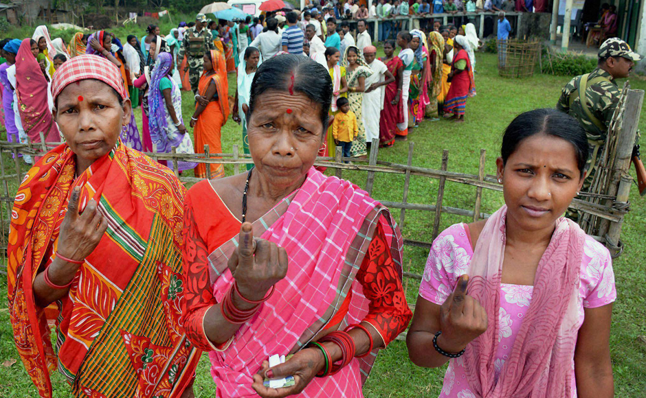 Tea tribe women show their inked fingers after casting their vote during the first phase of the Assembly Elections for Duliajan Assembly Constituency at Bordubi in Assam on Monday. Credit: PTI