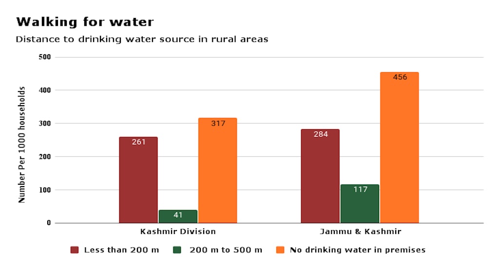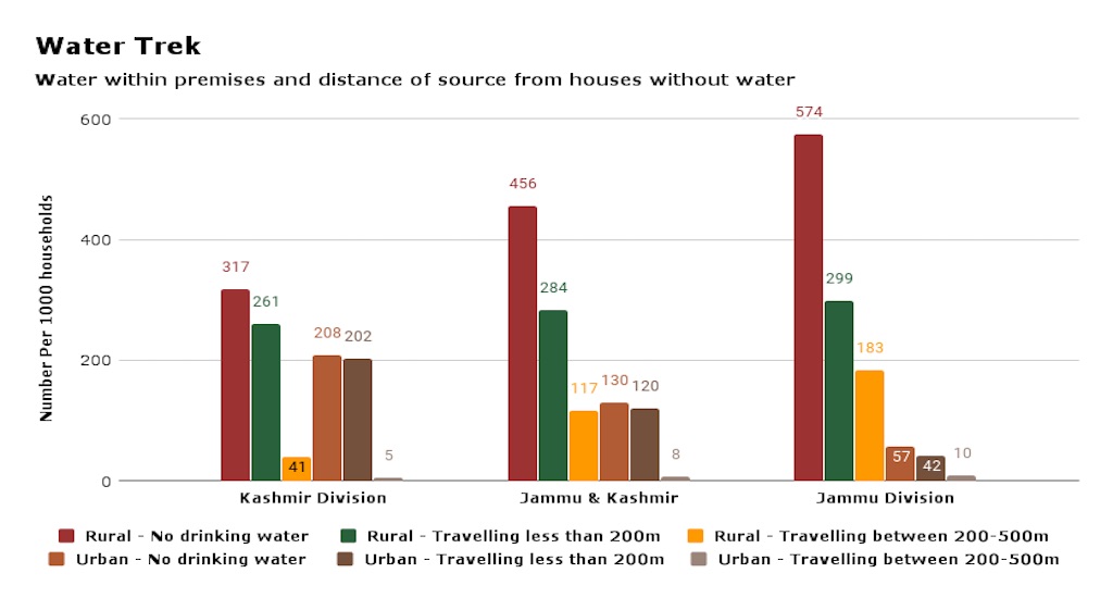 In Jammu Division, where there is no drinking water source within the premises, 29.9% people in rural areas and 4.2% people in urban areas travel less than 0.5 km to reach principal source of drinking water. In Kashmir Division, 26.1% households in rural areas travel less than 0.5 km to reach a water source outside their premises.