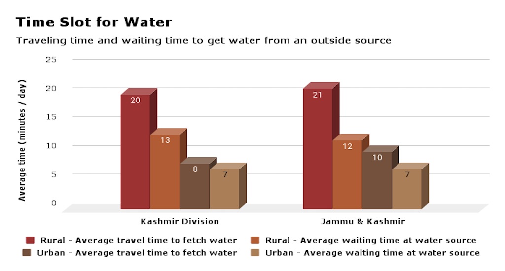 The district level results of the survey reveal that rural areas of Reasi district in Jammu Division fares the poorest. A household member spends an average traveling time of 34 minutes and a waiting time of 17 minutes. Reasi is followed by Rajouri district where a person spends 30 minutes of travel time, with 16 minutes of waiting time. Akhtar and her neighbours of Bonipora in Kupwara district spend at least two hours every day for fetching water.