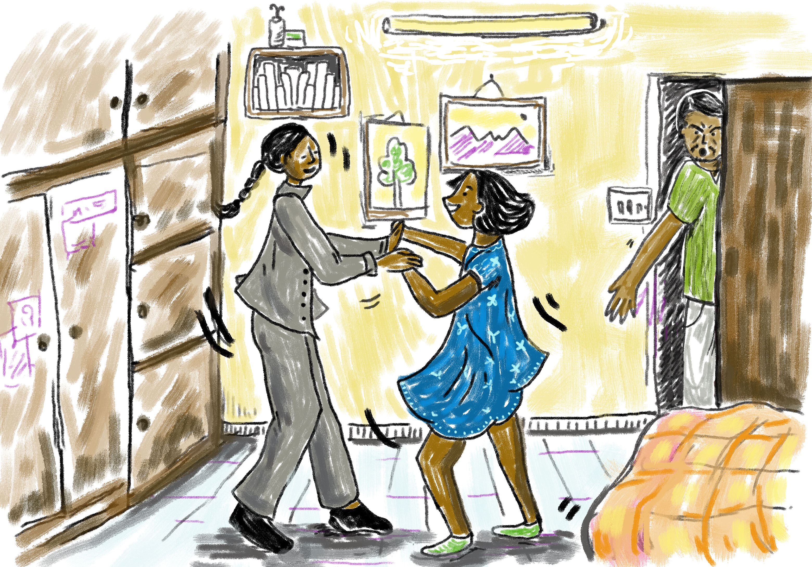 "Didi dressed up in Baba's three-piece suit for fun, and I wore my best party dress. It was a little too large for me still, but I loved it because it was blue, Ma’s favourite colour. Giggling together, Didi and I started waltzing around our room. That’s when Baba walked in. He was furious." Illustration: Ita Mehrotra