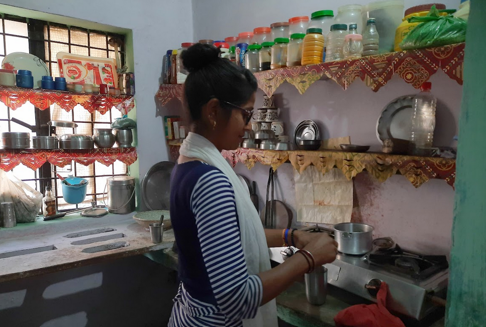 Sonam is not only a waste picker; she picks up additional, seasonal work from time to time. In this photo, she is working in a kitchen, during a busy wedding season in Chitrakoot.