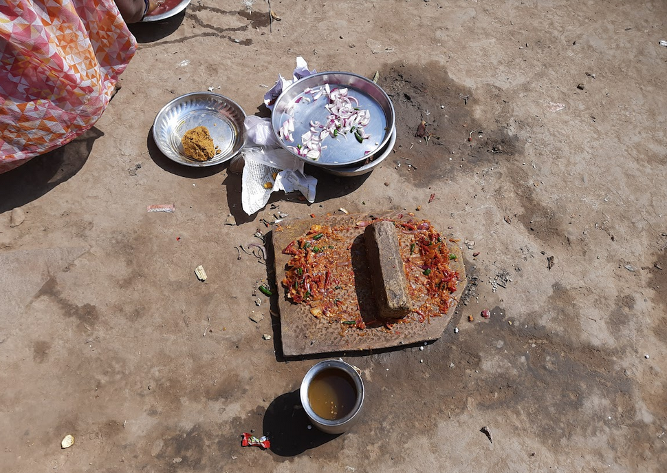 Sonam makes masala on a stone grinder. Her basti doesn't have electricity, so they borrow power from a pole in the nearby railway station to charge their phones.