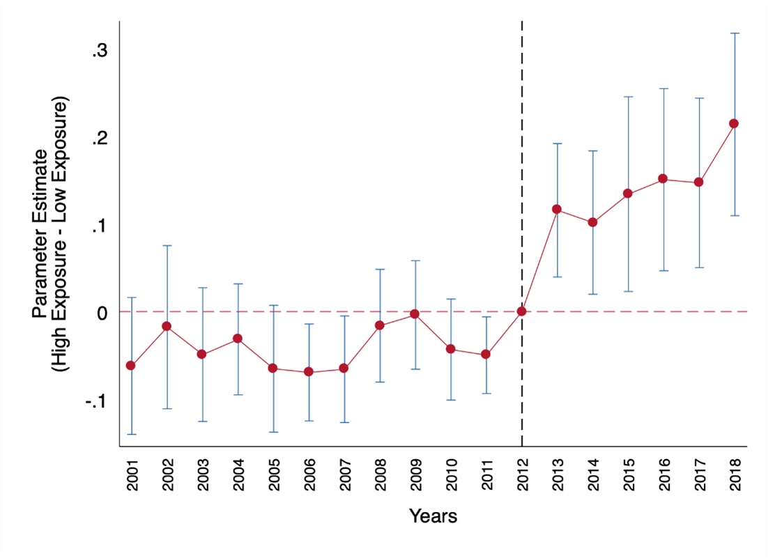 I find that districts that were more exposed witnessed a sharp increase in reported GBV after the incident than districts that were less exposed (depicted by the positive and statistically significant estimates after 2013 in Figure 1 below). I also find that before the incident took place there was no systematic difference in the trend of reported GBV between the more and the less exposed districts (notice that the point estimates are not statistically different from zero before 2012); thereby, lending credibility to the identification strategy.