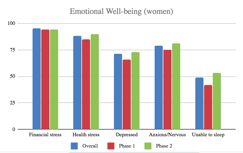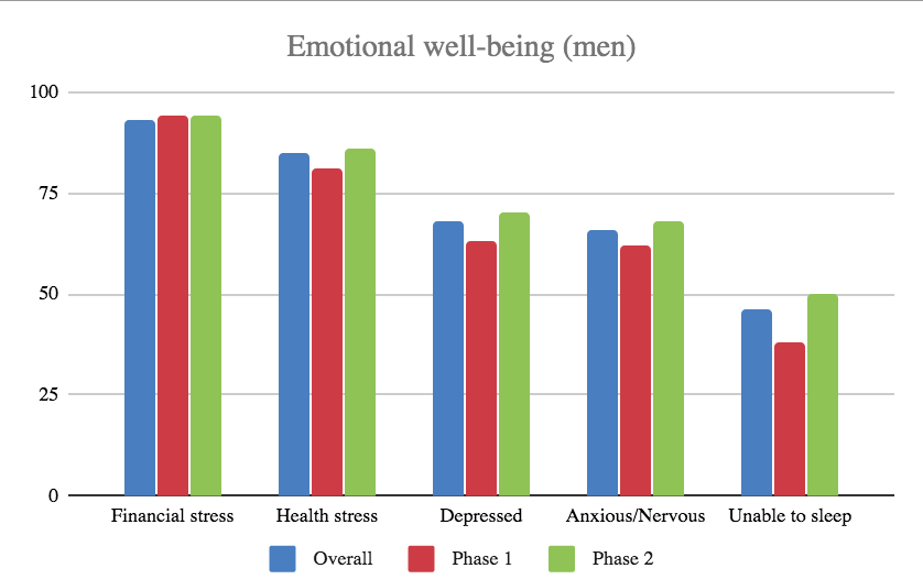 We decipher an increase in health concerns, depression and anxiety, as well as sleep disorders in Phase 2 relative to Phase 1 for both men and women. Women continue to exhibit higher levels of stress, overall, than men.