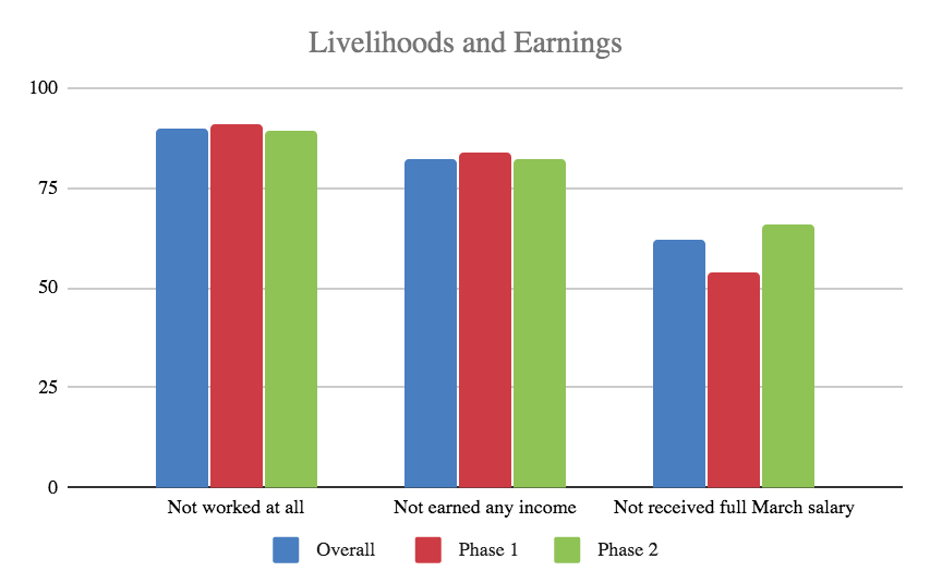 Overall, our survey continues to indicate a massive shock to the livelihoods and wage earnings of these families. As expected, the vast majority of the workers in these residential areas (~90% of the men) have been completely unable to work, and this situation has not eased over time, as suggested by the responses in Phase 2, even with the relaxing of some restrictions.