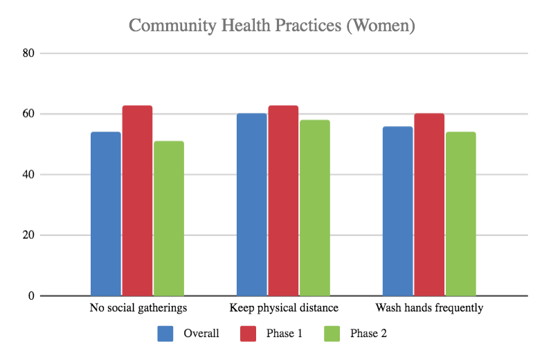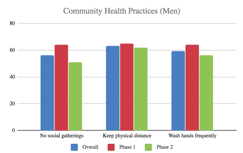 The overwhelming – and worrying – answer is ‘no’. Community health practices, in terms of avoiding social interactions and maintaining personal hygiene, have not gone up and may have gone down. This is particularly true for social gatherings, which seem more likely to occur in Phase 2.