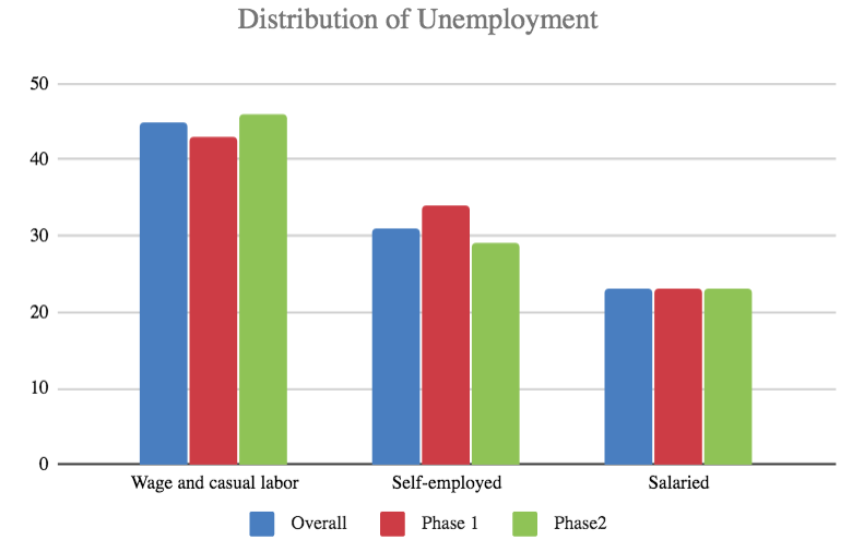 A larger proportion of those reporting unemployment are casual workers (~20%) in Phase 2 compared to Phase 1 (~9%). In terms of loss of livelihoods, wage labourers (for example, those employed in a specific sector such as manufacturing) and casual labourers (daily wagers not attached to one specific sector), thus, are by far the most adversely affected (45%), followed by the self-employed in informal sector (~31%).