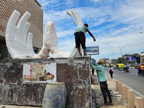 Workers installing a sculpture South Extension, New Delhi, September 6, 2023. Photo: Shukla Sawant